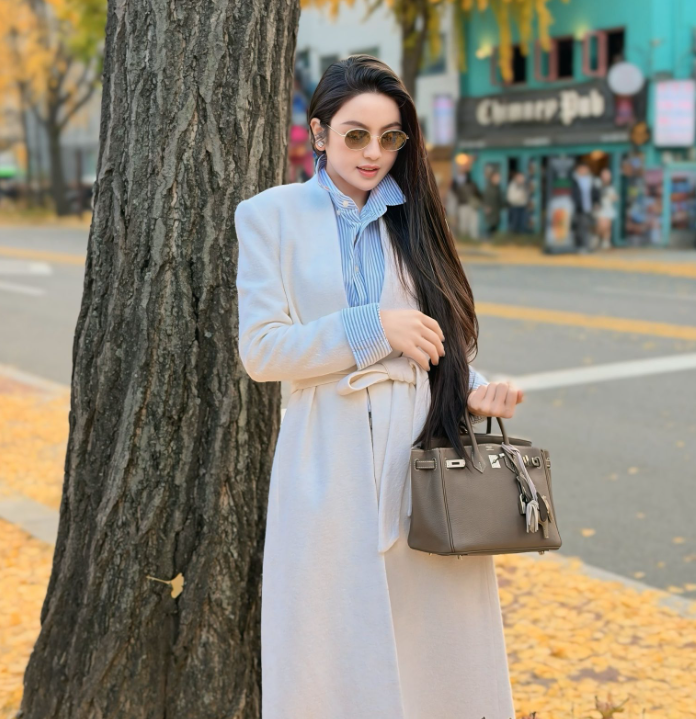 Điểm nhấn hoàn thiện cho bộ trang phục chính là chiếc túi Hermès Birkin, vốn được coi là biểu tượng của sự tinh tế. Thiết kế hình thang cứng cáp, hai tay cầm cuộn tròn cùng hệ thống khóa xoay đặc trưng khiến Birkin vừa sang trọng vừa nổi bật. Giá trị thực sự của chiếc túi nằm ở sự chế tác thủ công tinh xảo, mỗi chiếc Birkin đều được hoàn thiện tỉ mỉ bằng tay.