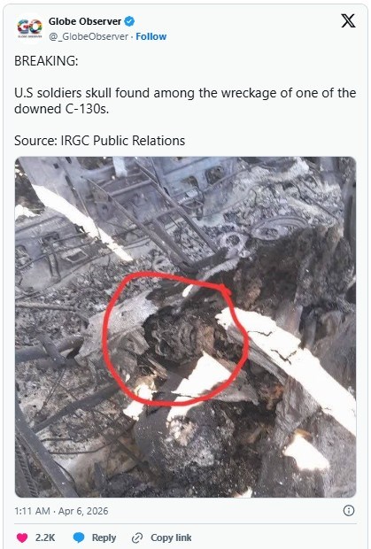 Người có tầm ảnh hưởng trên mạng xã hội Mario Nawfal viết: "Iran tuyên bố đã tìm thấy hộp sọ của một binh sĩ Mỹ trong đống đổ nát của máy bay C-130 bị phá hủy. Nhưng Bộ Tư lệnh Trung tâm Mỹ (CENTCOM) cho biết không có người nào thiệt mạng và xác nhận chiếc máy bay đã bị lực lượng Mỹ cố tình phá hủy. Tehran cũng tuyên bố đã bắn hạ chúng, trái ngược với thông tin từ Mỹ. Hiện chưa có xác nhận chính thức".