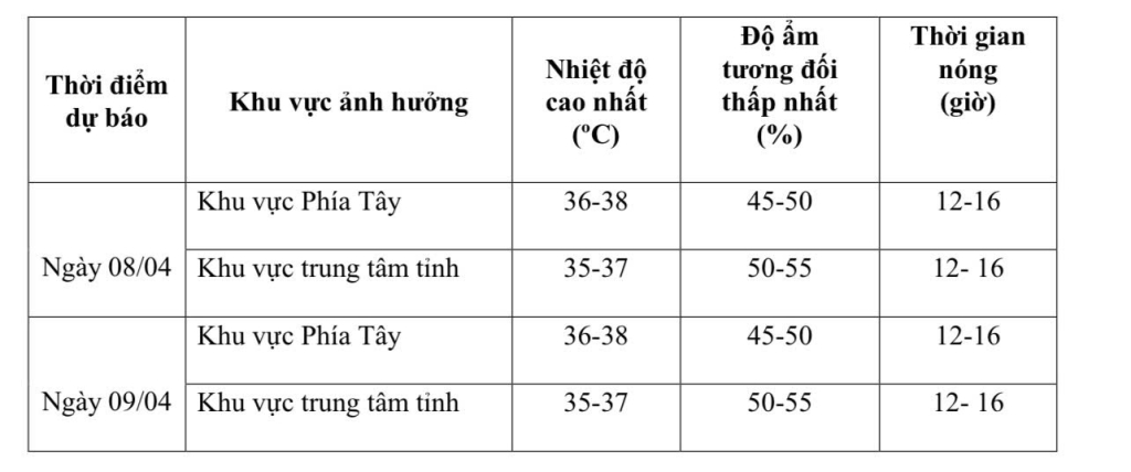 Dự báo diễn biến nắng nóng trong 24 giờ đến 48 giờ tới: Do chịu ảnh hưởng của rìa phía Nam rãnh áp thấp có trục ở khoảng 25 - 28 độ Vĩ Bắc nối với áp thấp nóng phía Tây phát triển mạnh. Ngày 8, 9/4, tỉnh Cao Bằng tiếp tục xảy ra nắng nóng, có nơi nóng gay gắt ở một số khu vực. Nhiệt độ cao nhất phổ biến: 36 - 38°C có nơi trên 38°C. Độ ẩm tương đối thấp nhất phổ biến 45 - 50%.