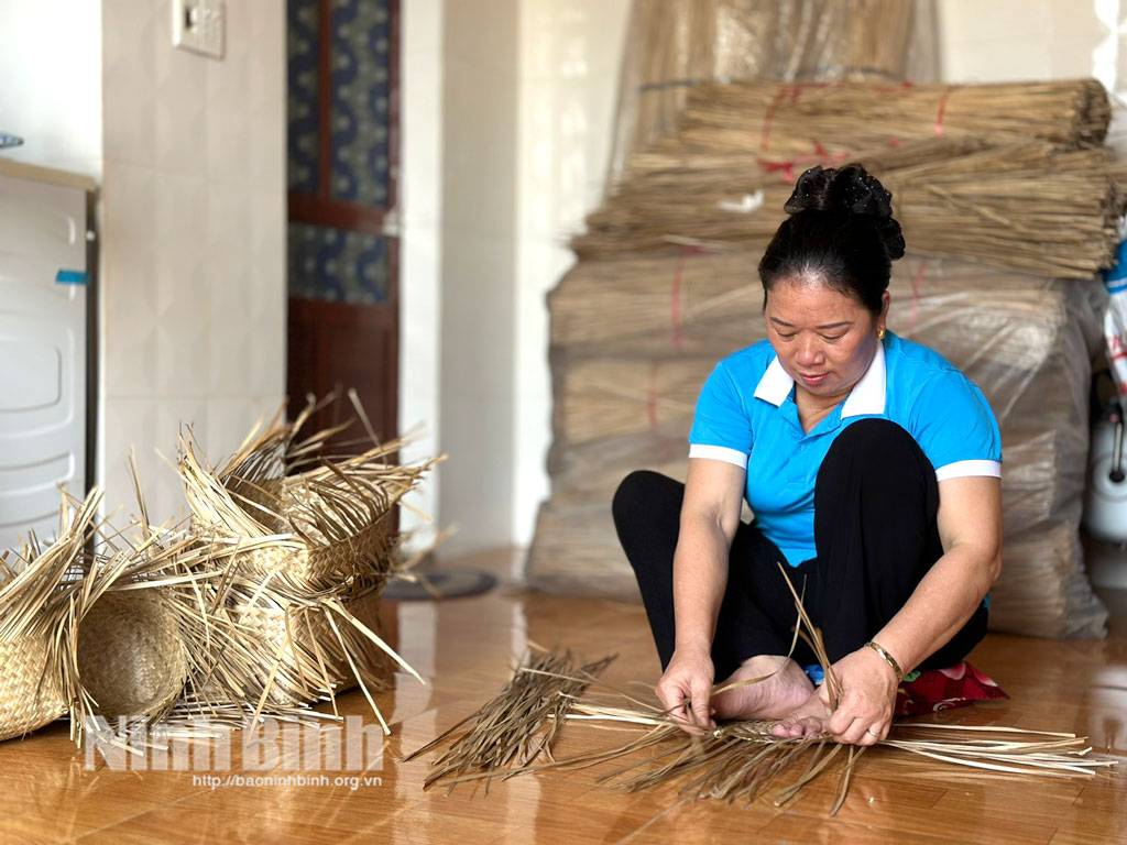 Cùng với nuôi trồng thủy sản, chị Nguyễn Thị Duyên, xóm 9, xã Rạng Đông còn làm thêm nghề đan thủ công mỹ nghệ để cải thiện thu nhập.