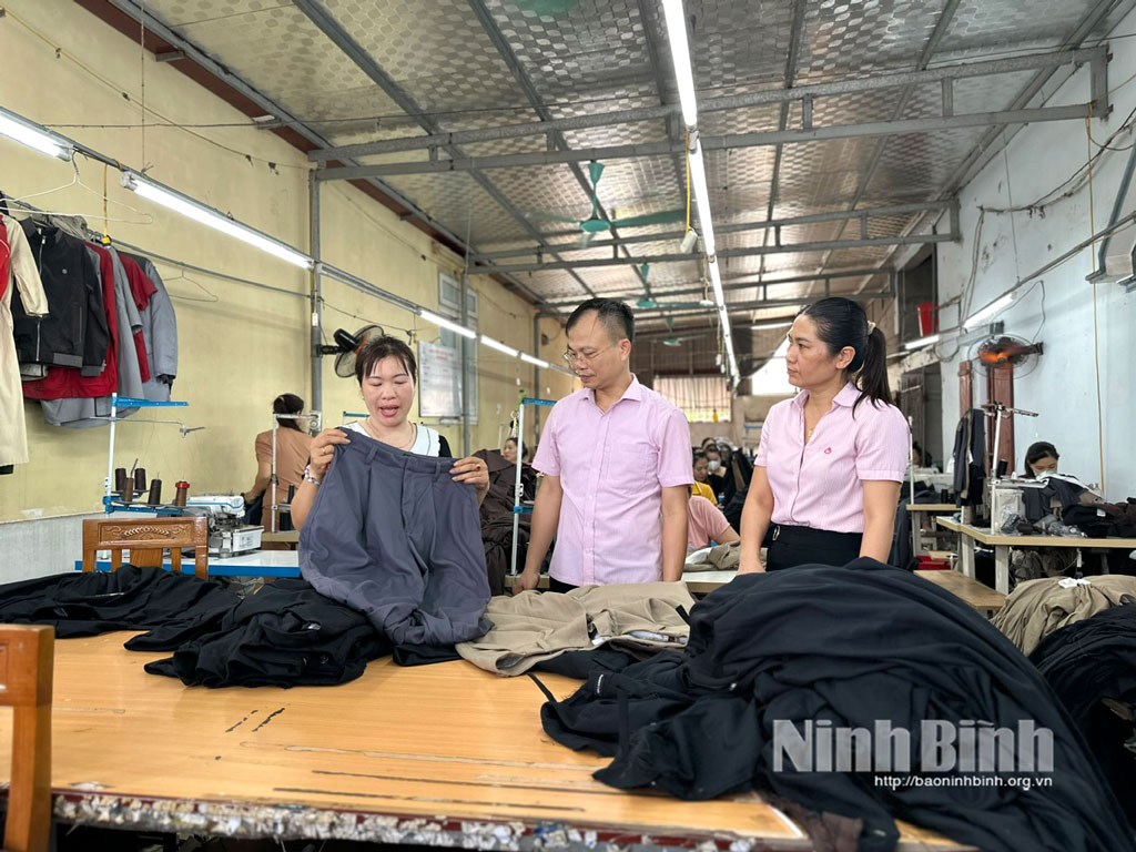 Cán bộ Phòng giao dịch NHCSXH Hải Hậu khảo sát mô hình may mặc của gia đình chị Nguyễn Thị Như, xã Hải Xuân.