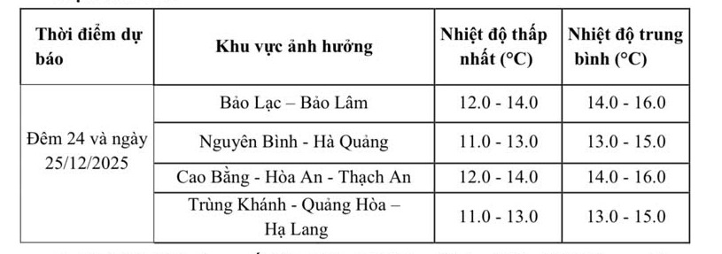 Cảnh báo khả năng xuất hiện thiên tai đi kèm: Ngày và đêm 24/12 khu vực Cao Bằng nhiều mây, có mưa, mưa rào rải rác. Từ ngày 25/12 trời rét đậm.
