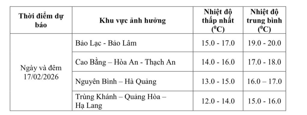 Dự báo diễn biến không khí lạnh 24 giờ đến 48 giờ tới: Khoảng gần sáng ngày 17/2, bộ phận không khí lạnh này sẽ ảnh hưởng đến thời tiết tỉnh Cao Bằng. Do ảnh hưởng của không khí lạnh, thời tiết các khu vựctrong tỉnh nhiều mây, có mưa nhỏ ở vài nơi, trời rét có nơi rét đậm. Gió Đông Bắc cấp 2 - 3. Nhiệt độ thấp nhất từ 12 - 14oC.