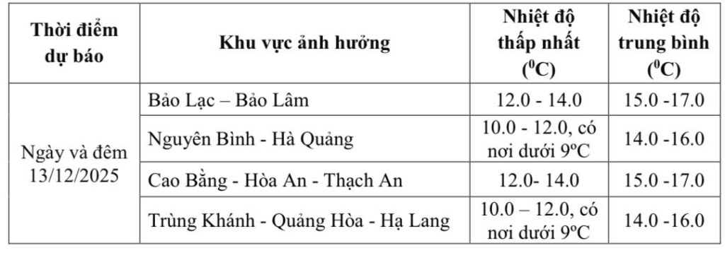 Dự báo diễn biến không khí lạnh 24 giờ đến 48 giờ tới: Khoảng ngày 13/12, bộ phận không khí lạnh này sẽ ảnh hưởng đến thời tiết tỉnh Cao Bằng. Thời tiết trong tỉnh nhiều mây, có mưa, mưa rào ở nhiều nơi, có nơi có dông.