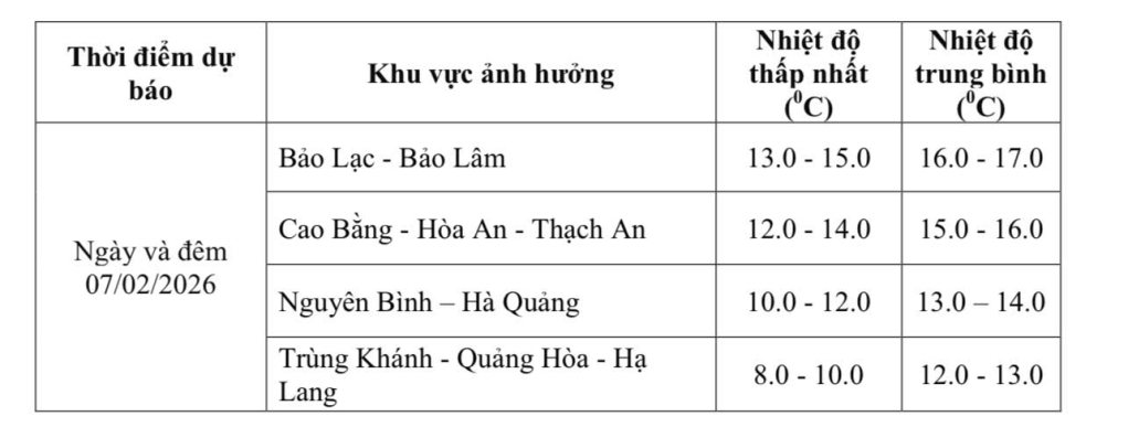 Dự báo diễn biến không khí lạnh 24 giờ đến 48 giờ tới: Khoảng trưa, chiều (7/2), bộ phận không khí lạnh sẽ ảnh hưởng đến thời tiết tỉnh Cao Bằng. Do ảnh hưởng của không khí lạnh, ngày 7/2, thời tiết các khu vực trong tỉnh nhiều mây, có mưa, mưa nhỏ ở nhiều nơi. Trời rét đậm, rét hại. Gió