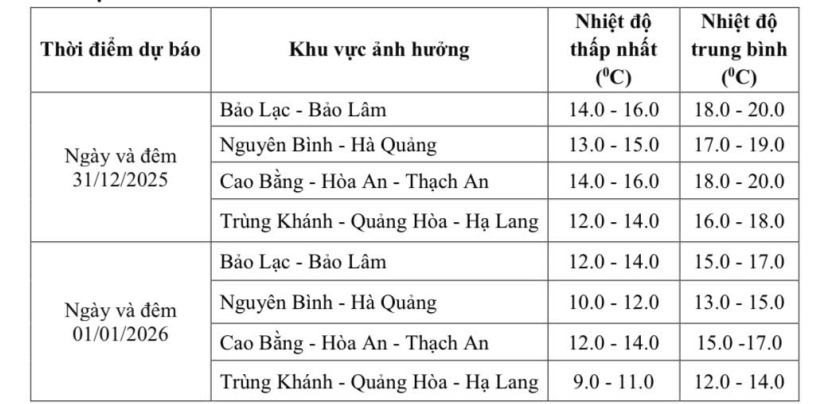 Cảnh báo khả năng xuất hiện thiên tai đi kèm: Đêm 31/12/2025 đến ngày 1/1/2026, khu vực tỉnh Cao Bằng có mưa, mưa nhỏ ở nhiều nơi. Từ đêm 1/1 rời rét đậm, có nơi rét hại.