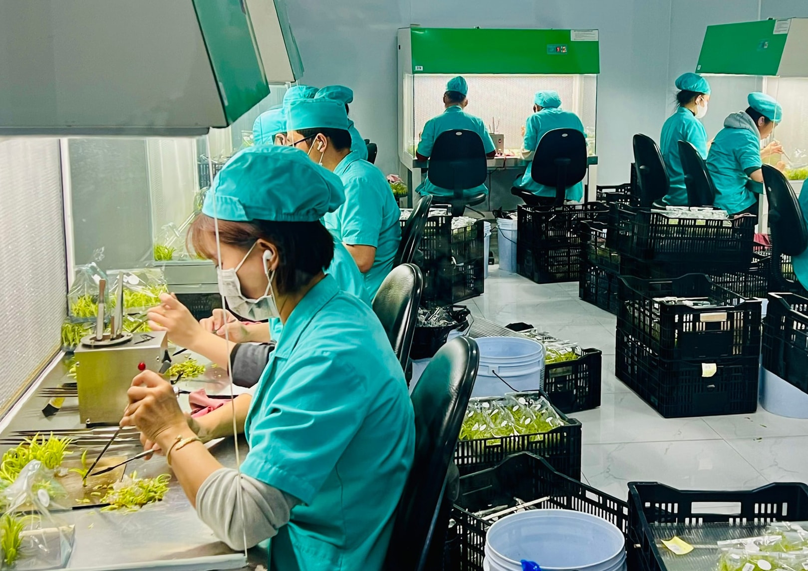 Nuôi cấy mô, xuất khẩu giống hoa là một ngành có nhiều triển vọng tăng trưởng tại Lâm Đồng (Ảnh: Lao động đang làm việc tại Công ty Công nghệ sinh học F1)