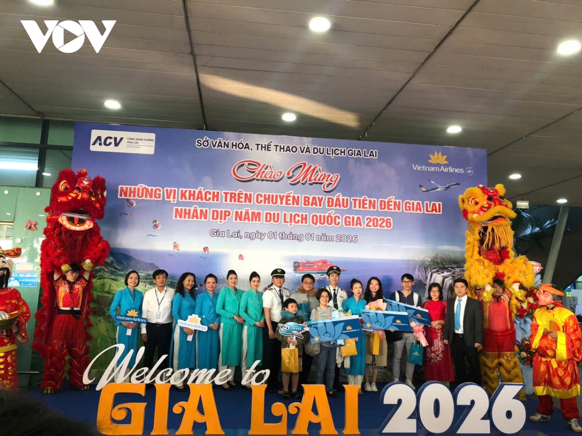 Phóng viên Hoàng Qui/VOV-Tây Nguyên cho biết, mở đầu cho chuỗi sự kiện Năm Du lịch Quốc gia – Gia Lai 2026, sáng 1/1, Sở Văn hóa, Thể thao và Du lịch tỉnh Gia Lai phối hợp với Cảng Hàng không Phù Cát, Hãng Hàng không VietnamAirlines và Hiệp hội Du lịch tổ chức đón những vị khách đầu tiên đến Gia Lai trong năm mới.