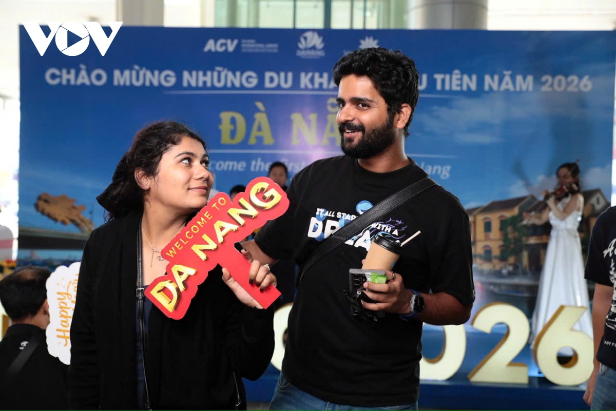 Phóng viên Đình Thiệu/VOV-Miền Trung thông tin, sáng nay (1/1), thành phố Đà Nẵng đồng loạt tổ chức chào đón những du khách đầu tiên đến tham quan thành phố trong năm mới 2026 tại Cảng hàng không quốc tế Đà Nẵng, Cảng hàng không Chu Lai, phố cổ Hội An… mở đầu một năm du lịch sôi động, kỳ vọng tăng trưởng bứt phá.