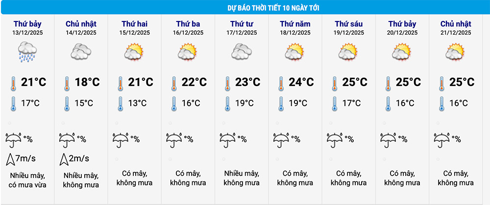 Từ 14/12 đến hết 21/12, thời tiết khu vực này tạnh ráo. Trong đó, nhiệt độ cao nhất trong ngày 14/12 giảm còn 18°C, nhiệt độ thấp nhất 15°C, trời rét.