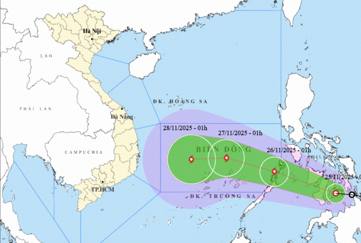 Dự báo đến 1h ngày 26/11, áp thấp nhiệt đới khả năng đi vào vùng biển phía Đông Nam khu vực giữa Biển Đông, có thể mạnh lên thành bão, cơn bão số 15 trong năm 2025 hoạt động trên khu vực biển này. Bão di chuyển theo hướng Tây Tây Bắc, tốc độ khoảng 20-25 km/h với cường độ mạnh cấp 8, giật cấp 10.