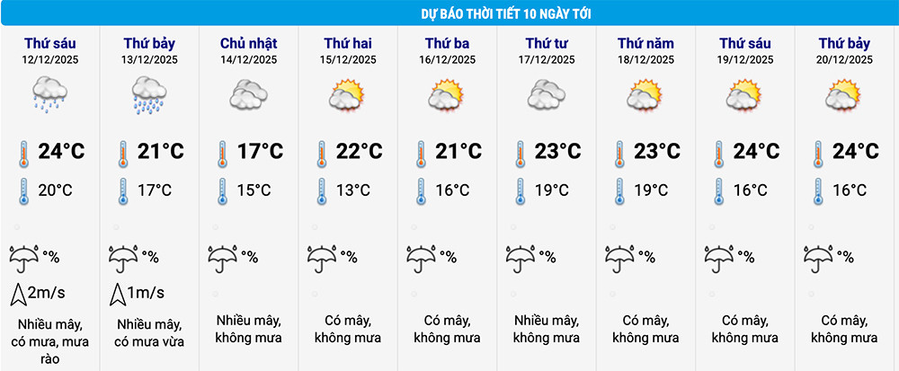 Ngoài ra, theo bảng cập nhật thời tiết 10 ngày tại khu vực trung tâm TP Hà Nội, ngày 12/12, trời có mưa, mưa rào, nhiệt độ trong ngày duy trì mức 20-24°C. Sang ngày 13/12, khu vực này xuất hiện mưa vừa, nhiệt độ xu hướng giảm dần, cao nhất 21°C, thấp nhất 17°C.