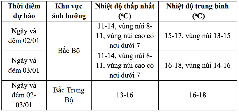 Bắc Bộ và Bắc Trung Bộ trời rét, vùng núi Bắc Bộ rét đậm, có nơi rét hại. Nhiệt độ thấp nhất trong đợt không khí lạnh này ở Bắc Bộ phổ biến 11-14°C, vùng núi 8-11°C, vùng núi cao có nơi dưới 7°C; Bắc Trung Bộ 13-16°C. Vùng núi cao của Bắc Bộ cần đề phòng xảy ra băng giá.