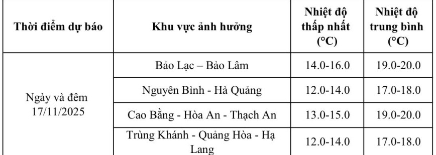 Dự báo diễn biến không khí lạnh trong 24 giờ đến 48 giờ tới: Khoảng đêm 17/11, bộ phận không khí lạnh sẽ ảnh hưởng đến các khu vực trong tỉnh Cao Bằng. Do ảnh hưởng không khí lạnh thời tiết trong tỉnh nhiều mây có mưa, mưa rào, trời rét. Gió Đông Bắc cấp 2, 3. Nhiệt độ thấp nhất phổ biến 9 - 11°C, vùng núi cao có nơi dưới 8°C.