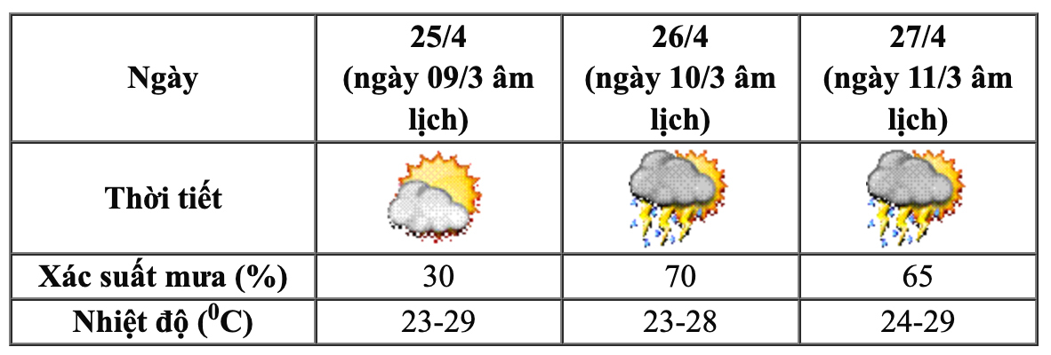 Ngày 25/4 (9/3 Âm lịch), xác suất mưa tại khu vực này ở mức thấp, khoảng 30%, thời tiết tương đối khô ráo, thuận lợi cho người dân và du khách tham gia các hoạt động. Tuy nhiên, sang hai ngày 26-27/4 (10-11/3 Âm lịch), xác suất mưa tại đây tăng lên 65-70%, nguy cơ xuất hiện mưa dông rõ rệt hơn.