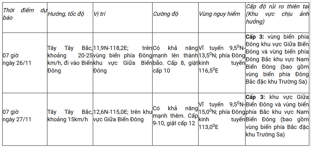 Khoảng chiều 26-28/11, khu vực giữa Biển Đông và vùng biển phía Bắc khu vực Nam Biển Đông (bao gồm vùng biển phía Bắc đặc khu Trường Sa) có khả năng chịu tác động của gió mạnh cấp 10-11, giật cấp 14.