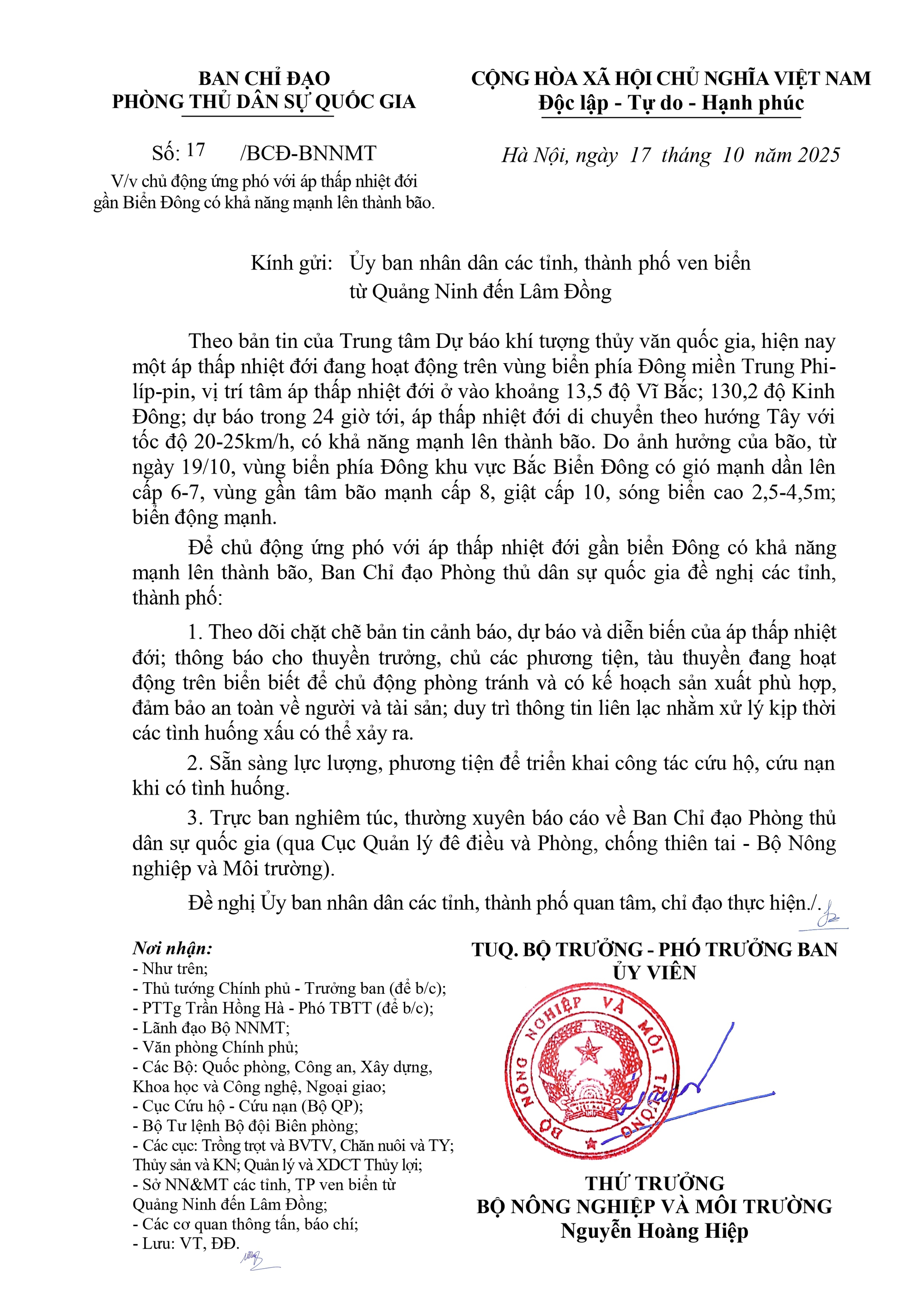 Ngày 17/10/2025, Ban Chỉ đạo Phòng thủ dân sự quốc gia đã có văn bản số 17/BCĐ-BNNMT gửi Ủy ban nhân dân các tỉnh, thành phố ven biển từ Quảng Ninh đến Lâm Đồng đề nghị chủ động ứng phó với áp thấp nhiệt đới gần Biển Đông có khả năng mạnh lên thành bão.
