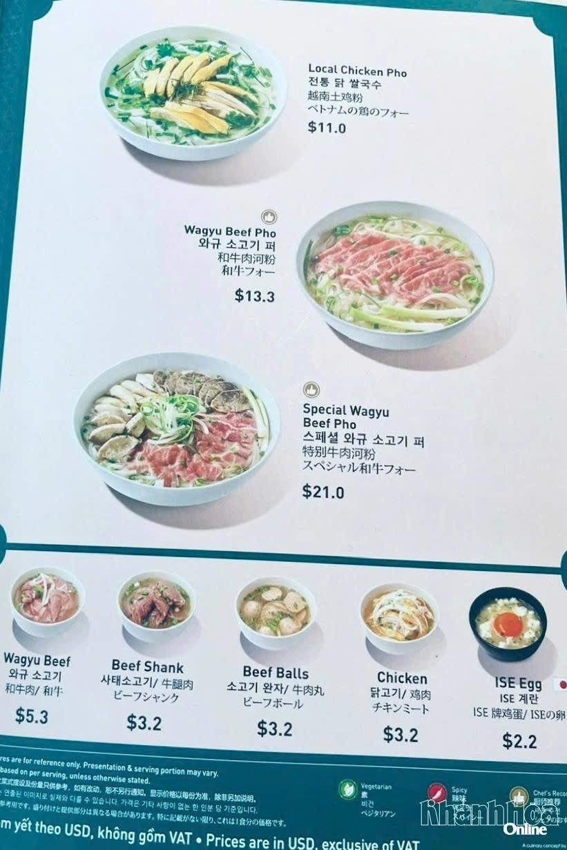Giá tô phở bò wagyu tại nhà hàng được niêm yết là 13,3 USD, tương đương gần 346.000 đồng. Khi thanh toán, nhân viên đã áp dụng mức giảm 5% theo chương trình khuyến mãi của công ty, thay vì tính nguyên giá.