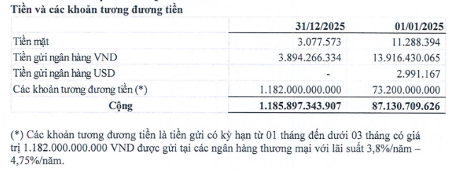 Tại thời điểm cuối năm 2025, tổng tài sản của Tín Nghĩa gần 2,156 tỷ đồng, tăng nhẹ so với đầu năm. Đáng chú ý, lượng tiền và tương đương tiền bất ngờ tăng vọt lên gần 1.186 tỷ đồng, gấp 13.6 lần đầu năm và chiếm 55% tổng nguồn vốn, với phần lớn 1.182 tỷ đồng gửi ngân hàng kỳ hạn dưới 3 tháng.