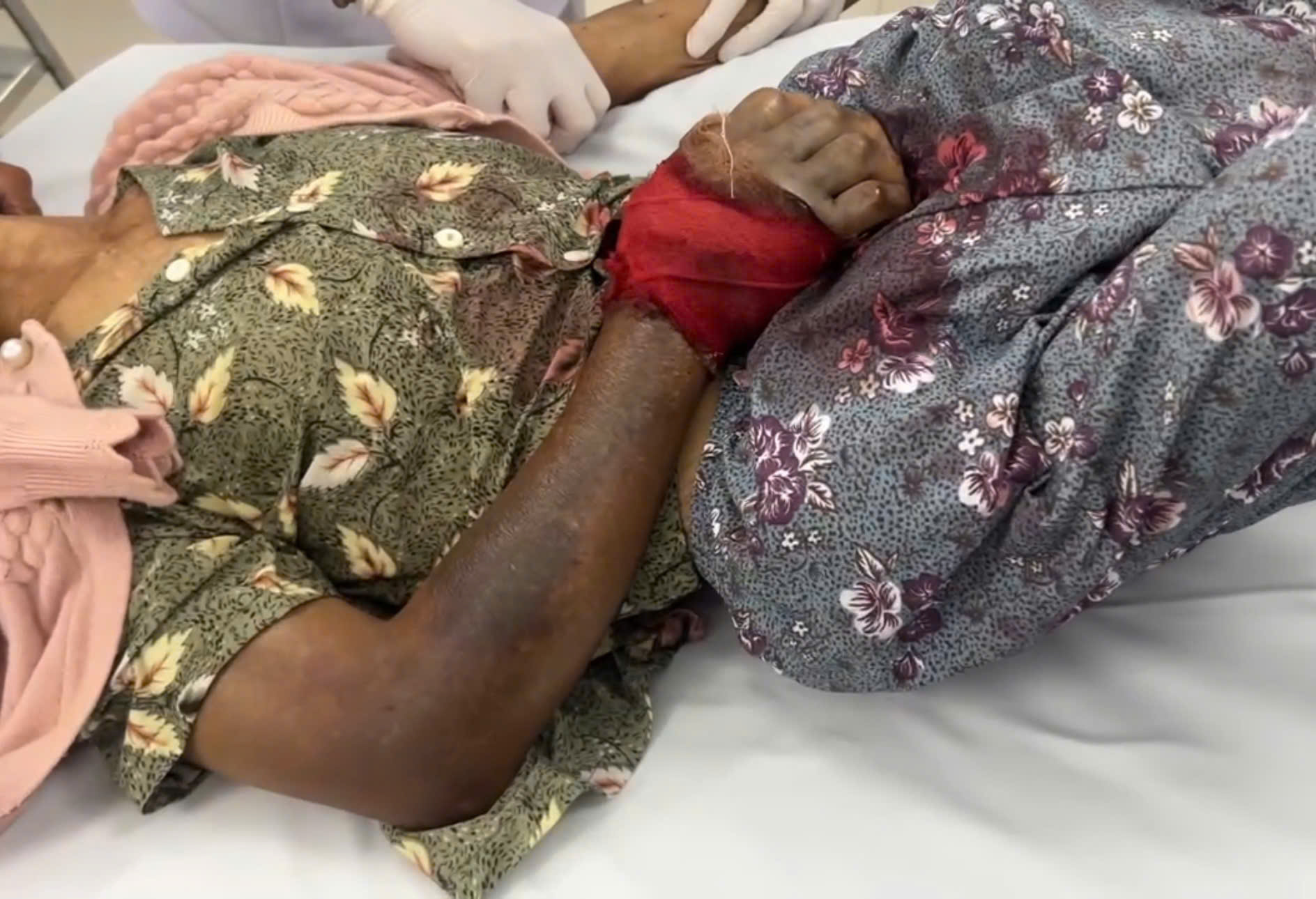 Tay nạn nhân bị rắn độc cắn sưng to, tím đen và có dấu hiệu hoại tử