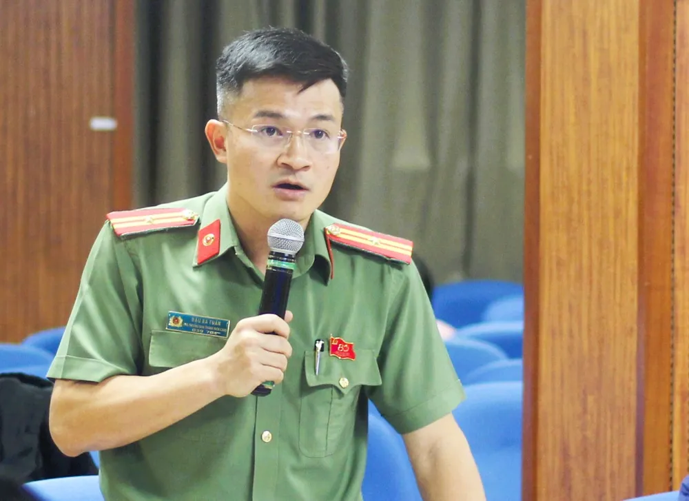 Thiếu tá Đậu Bá Tuấn, Phó Trưởng ban Thanh niên Công an trình bày tham luận tại hội nghị. Ảnh: VIẾT THỊNH