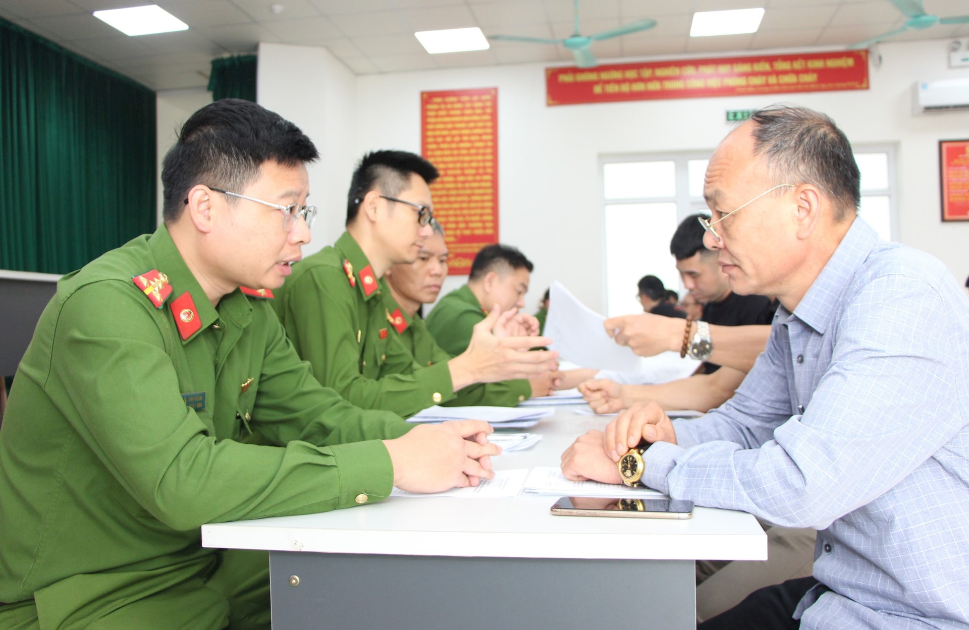 Cán bộ Đội Chữa cháy và cứu nạn, cứu hộ khu vực số 31 trao đổi, hướng dẫn chủ đầu tư, chủ cơ sở tại địa bàn phường Thanh Liệt và các xã Đại Thanh, Nam Phù, Ngọc Hồi giải pháp khắc phục vi phạm.