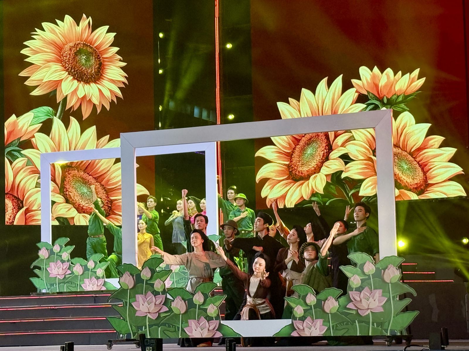 Mở đầu chương trình là liên khúc “Còn gì đẹp hơn - Thưa Đảng”, khắc họa vai trò lãnh đạo của Đảng trong hành trình đấu tranh giải phóng dân tộc. Không gian nghệ thuật tiếp tục được mở rộng qua các tiết mục như “Dòng sông phẳng lặng”, “Trường Sơn Đông - Trường Sơn Tây”, “Em vẫn đợi anh về”… gợi lại những năm tháng chiến tranh gian khổ nhưng đầy lạc quan, nghĩa tình.