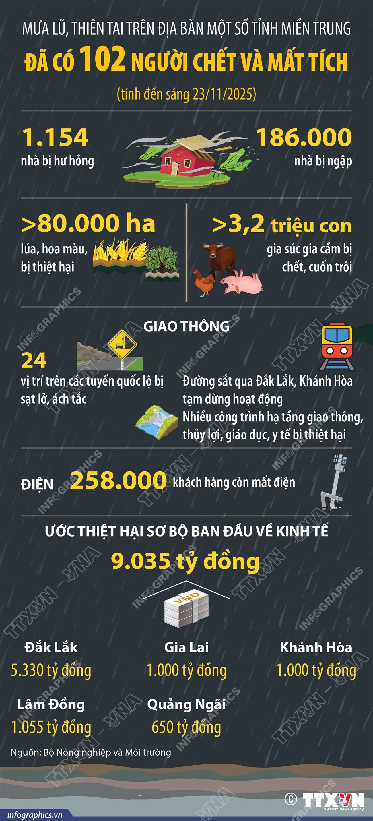 Nguồn VietnamPlus : https://www.vietnamplus.vn/tinh-den-sang-2311-mua-lu-o-mien-trung-khien-102-nguoi-chet-va-mat-tich-post1078738.vnp