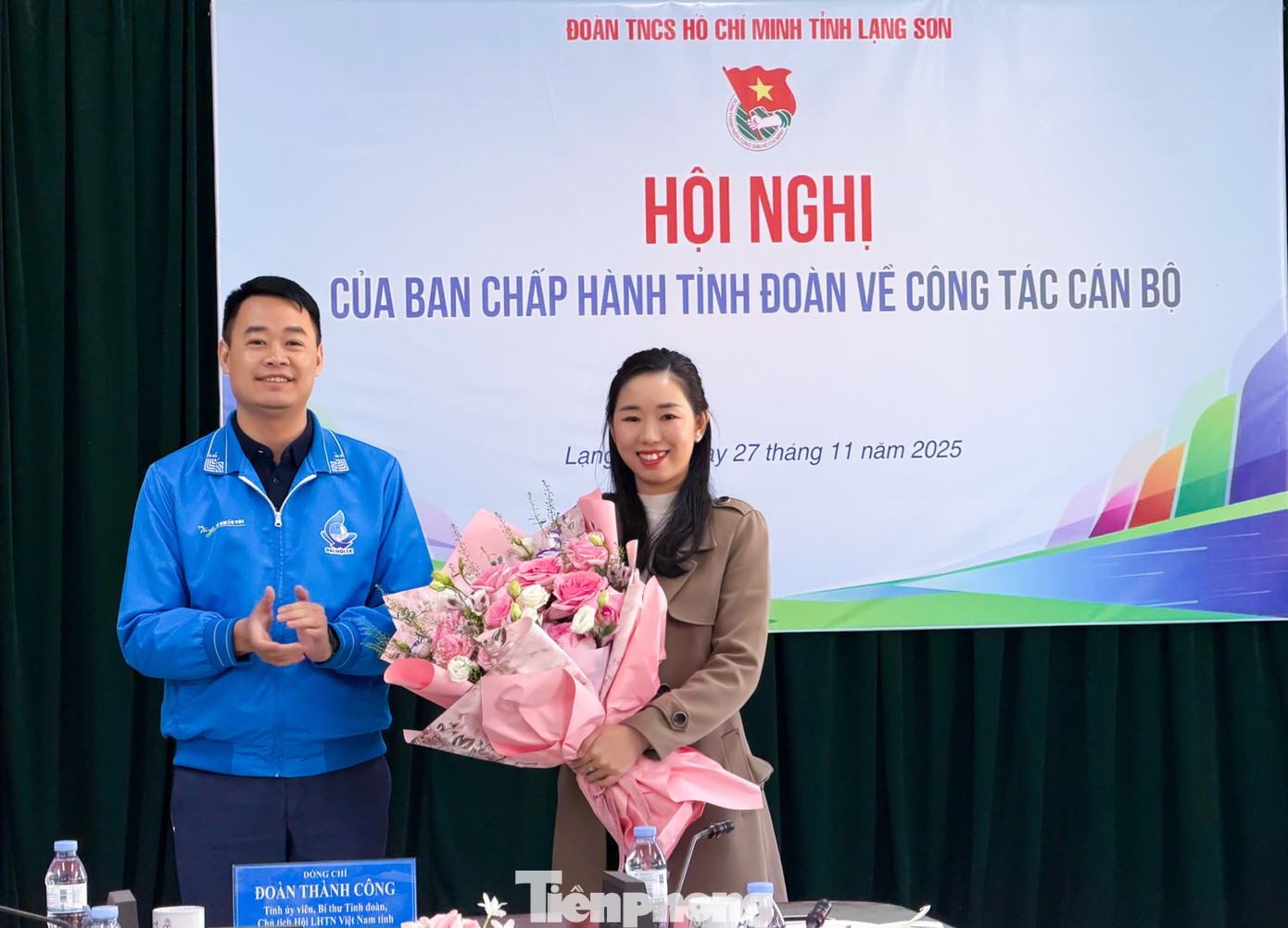 Anh Đoàn Thành Công - Bí thư Tỉnh Đoàn Lạng Sơn tặng hoa chúc mừng Phó Bí thư Tỉnh Đoàn Vi Thị Yến Quỳnh. Ảnh: Q.N.
