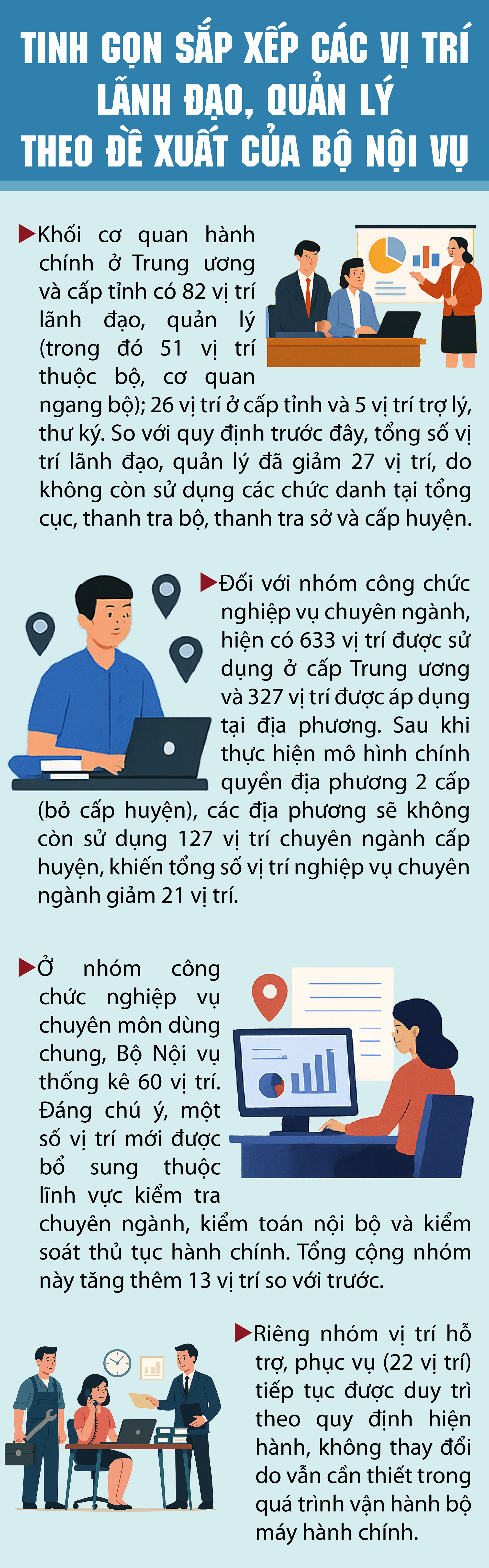 Theo kết quả rà soát, tổng số vị trí việc làm trong khối cơ quan hành chính do Chính phủ quản lý hiện nay là 849 vị trí, gồm 124 vị trí lãnh đạo - quản lý, 656 vị trí công chức nghiệp vụ chuyên ngành, 47 vị trí công chức nghiệp vụ chuyên môn dùng chung và 22 vị trí hỗ trợ, phục vụ.
