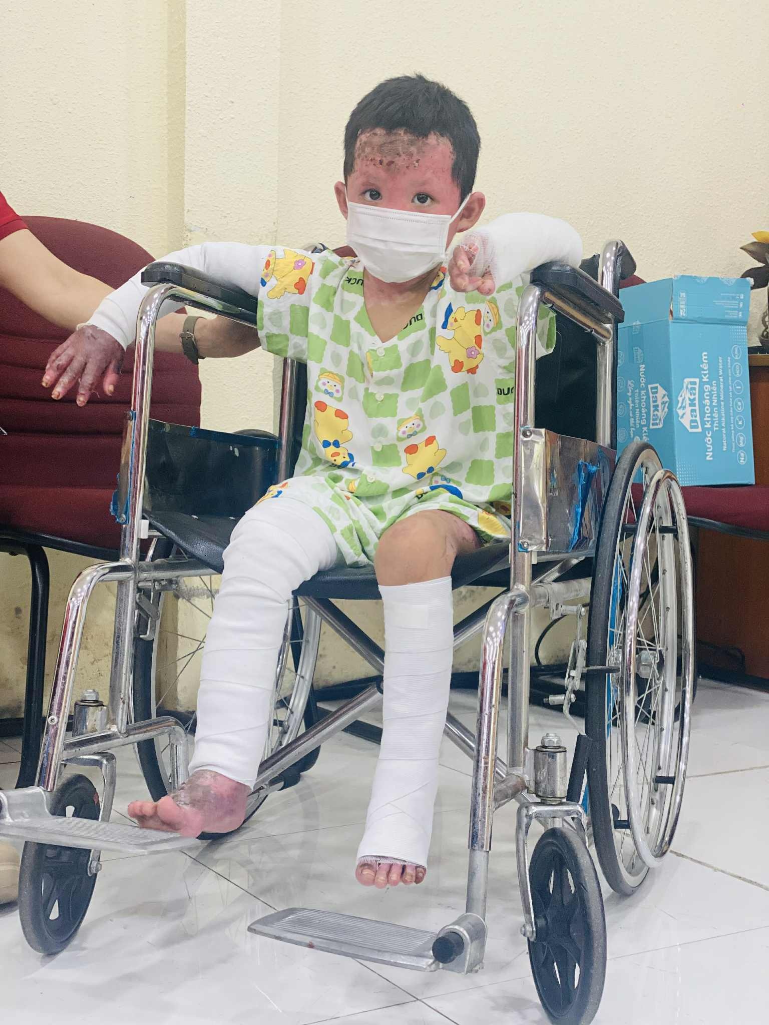 Diện tích tổn thương ước tính khoảng 65%, lan rộng từ đầu, mặt, lưng, bụng đến hai tay và hai chân. Bé vừa suy hô hấp do bỏng lửa và phù nề đường thở, vừa rơi vào sốc bỏng, hai yếu tố nguy hiểm nhất. Trong khí quản còn có bụi than, khiến việc thở càng khó khăn.
