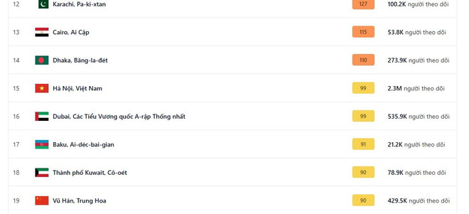 Thành phố Hồ Chí Minh cũng nằm trong nhóm có chất lượng không khí ở mức màu vàng "trung bình" với chỉ số AQI là 77, xếp thứ 24.