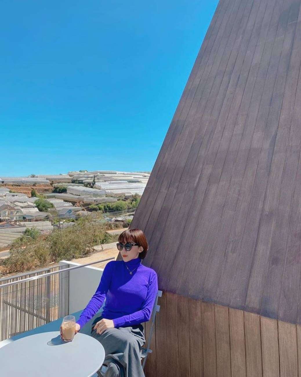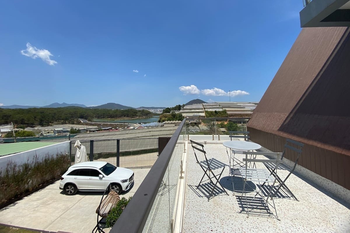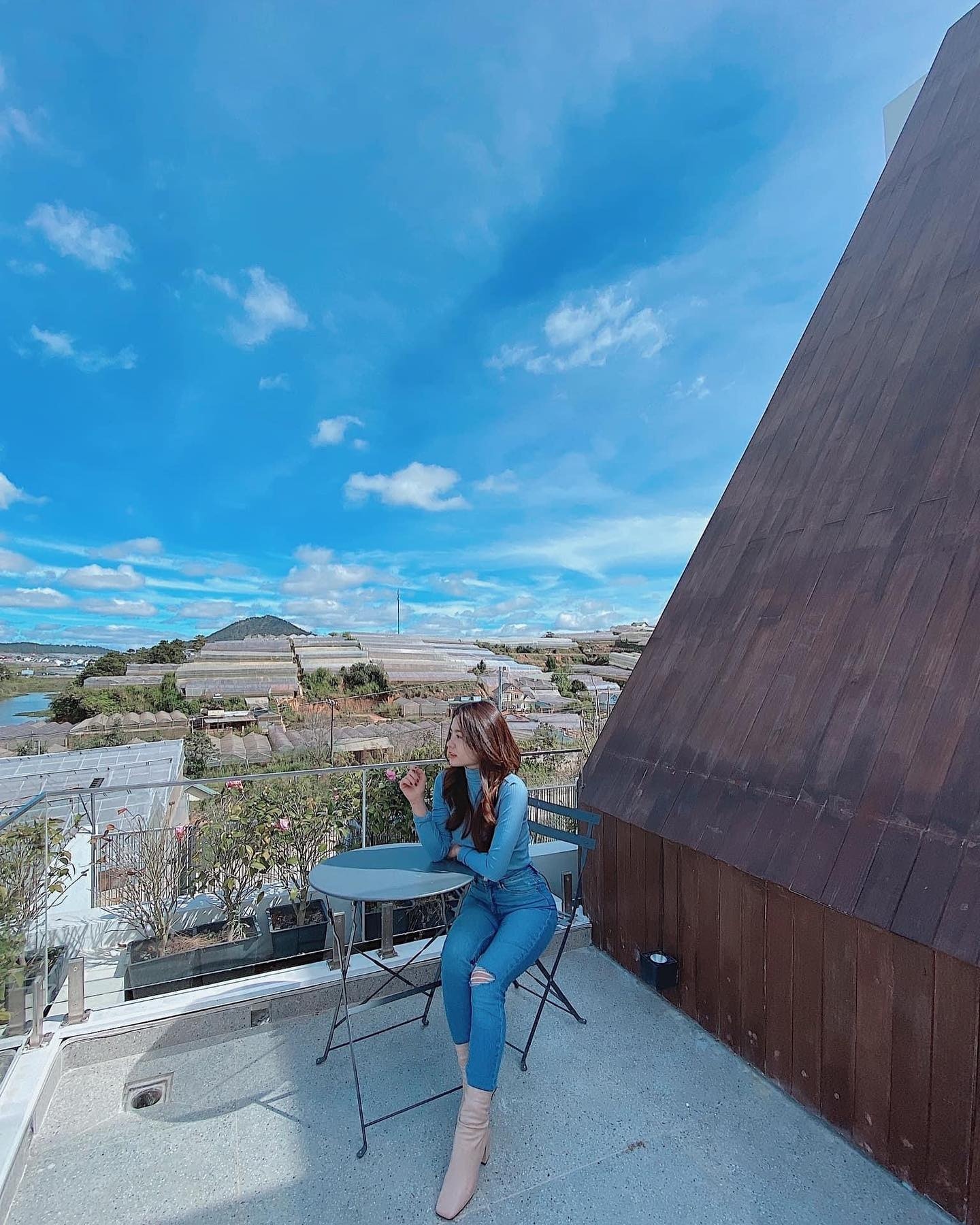 Khoảng sân thượng hướng ra đồi núi được thiết kế để uống trà, ngắm cảnh. Buổi tối, từ đây, du khách có thể ngắm nhà lồng trồng rau, hoa Đà Lạt lên đèn sáng rực. Trên Google và những nền tảng đặt phòng trực tuyến, villa cũng nhận về loạt đánh giá tốt từ nhiều du khách từng thuê.