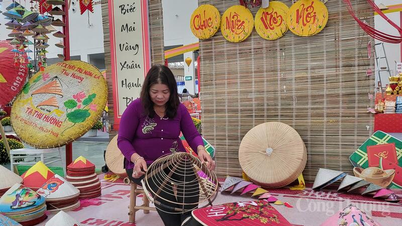 Chị Tạ Thu Hương, nghệ nhân làng nghề nón Chuông, Chủ tịch HĐQT Hợp tác xã Mây tre nón Thu Hương (xã Thanh Oai) trình diễn nghề làm nón tại Hội chợ Mùa Xuân. Ảnh: Ngọc Tiến