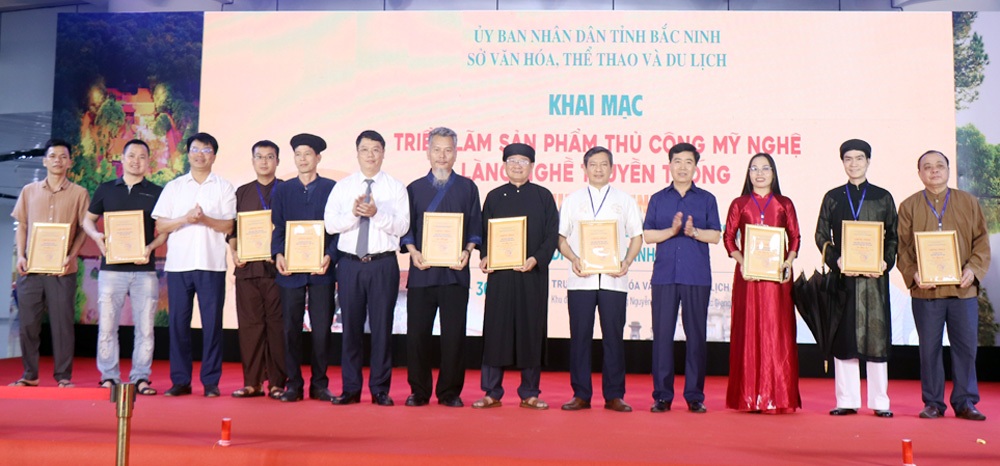 Ban Tổ chức trao chứng nhận tham gia triển lãm cho các nghệ nhân, đại diện làng nghề, cơ sở sản xuất thủ công mỹ nghệ.