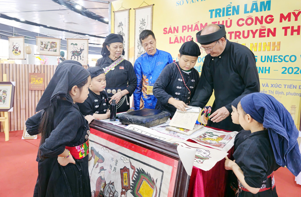 Thanh thiếu nhi trải nghiệm in tranh Đông Hồ dưới sự hướng dẫn của nghệ nhân.