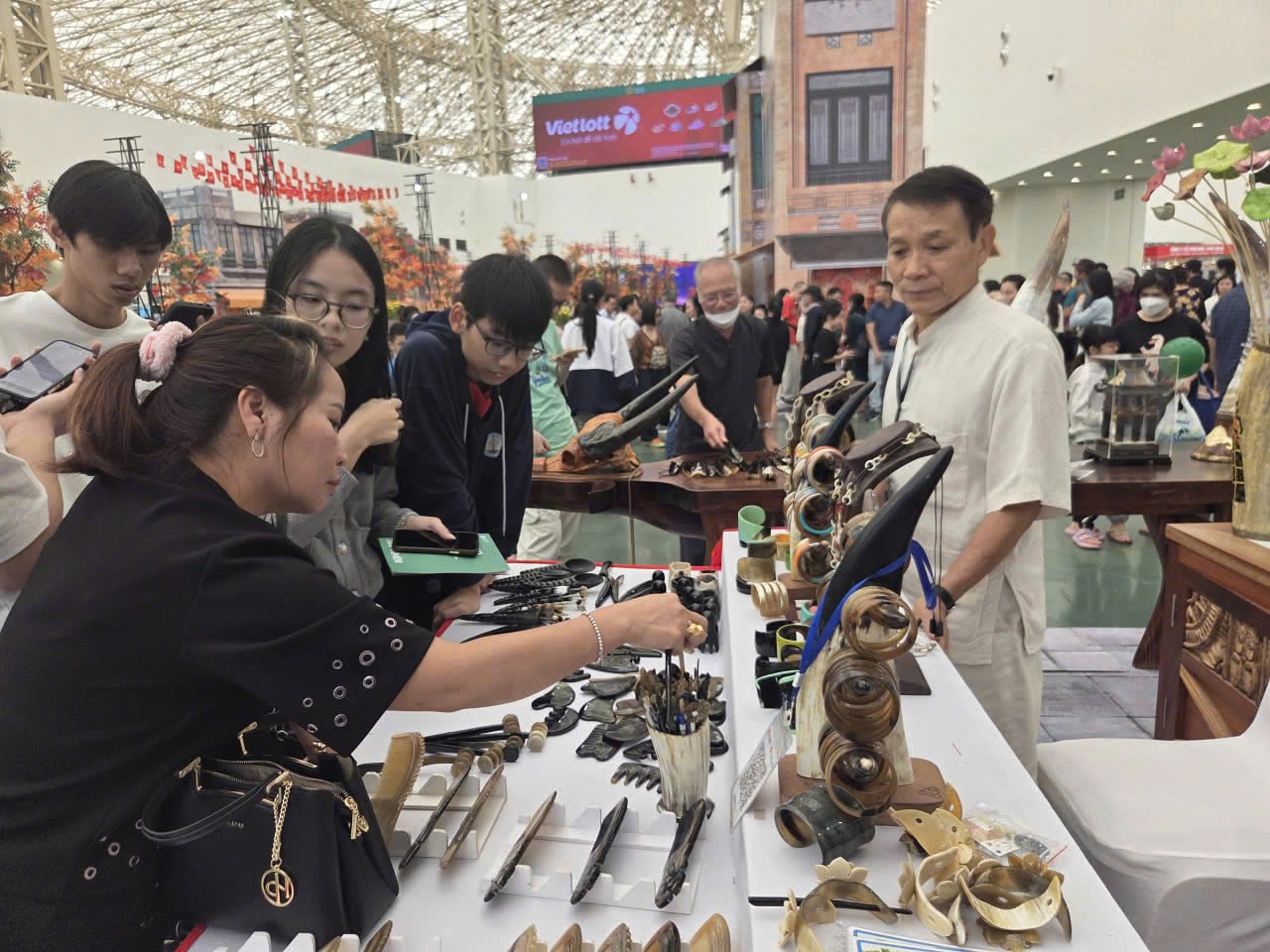 Còn tại gian hàng mỹ nghệ sừng Thụy Ứng (xã Thường Tín), nghệ nhân Nguyễn Văn Sử, chủ cơ sở Mười Sử, bận rộn giới thiệu các sản phẩm tinh xảo chế tác từ sừng trâu, bò - những món đồ kết hợp giữa kỹ thuật thủ công và thẩm mỹ hiện đại.