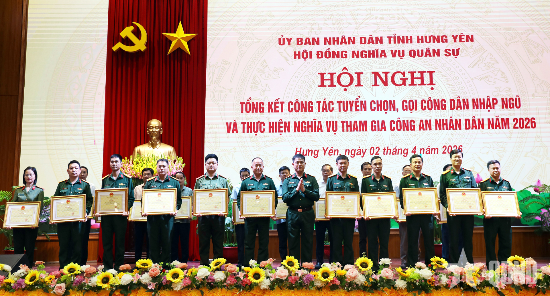 Lãnh đạo tỉnh Hưng Yên trao thưởng tặng các tập thể, cá nhân có nhiều thành tích trong công tác tuyển chọn, gọi công dân nhập ngũ và thực hiện nghĩa vụ tham gia Công an nhân dân năm 2026.