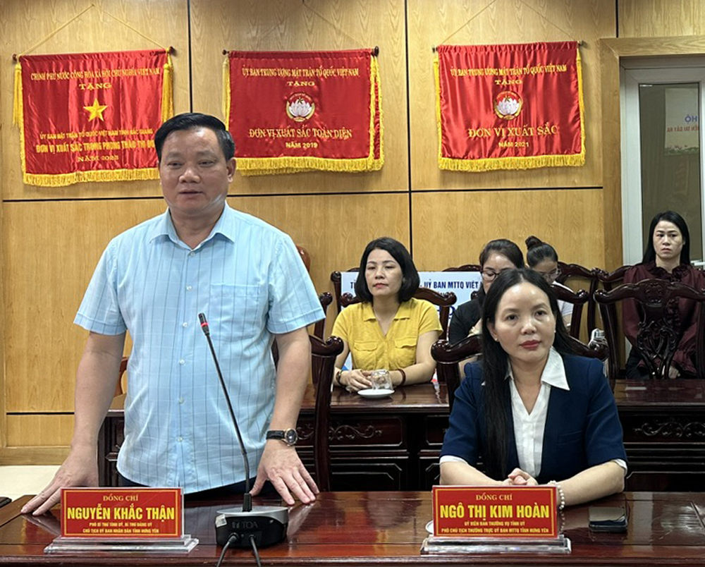 Tiếp đoàn công tác tỉnh Hưng Yên có các đồng chí: Vương Quốc Tuấn, Ủy viên dự khuyết Trung ương Đảng, Phó Bí thư Tỉnh ủy, Chủ tịch UBND tỉnh; Nguyễn Thị Hà, Ủy viên Ban Thường vụ Tỉnh ủy, Chủ tịch Ủy ban MTTQ tỉnh.