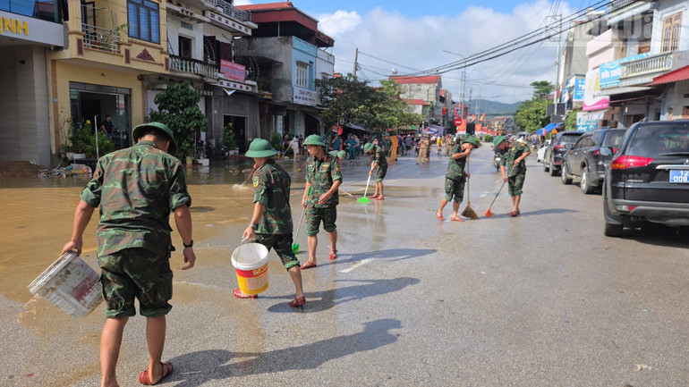 Lực lượng quân sự có mặt để giúp nhân dân khắc phục hậu quả mưa lũ.