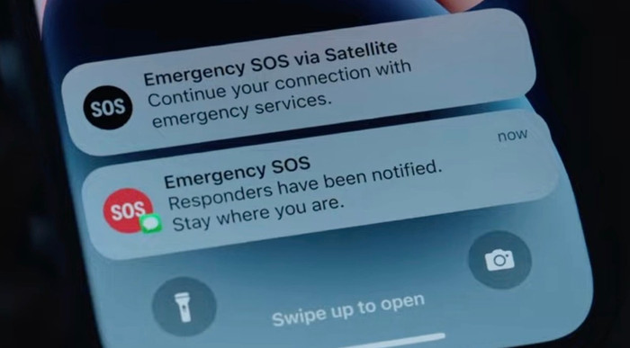 Tính năng Emergency SOS qua vệ tinh được Apple giới thiệu lần đầu cùng dòng iPhone 14 vào năm 2022. Khi không có mạng di động hoặc Wi-Fi, người dùng vẫn có thể gửi tin nhắn đến dịch vụ khẩn cấp thông qua kết nối vệ tinh. Để sử dụng, thiết bị cần ở ngoài trời, có tầm nhìn rõ lên bầu trời và đường chân trời. Apple khuyến nghị nên thử gọi khẩn cấp theo cách thông thường trước, nếu cuộc gọi không thực hiện được thì mới chuyển sang nhắn tin qua vệ tinh.
