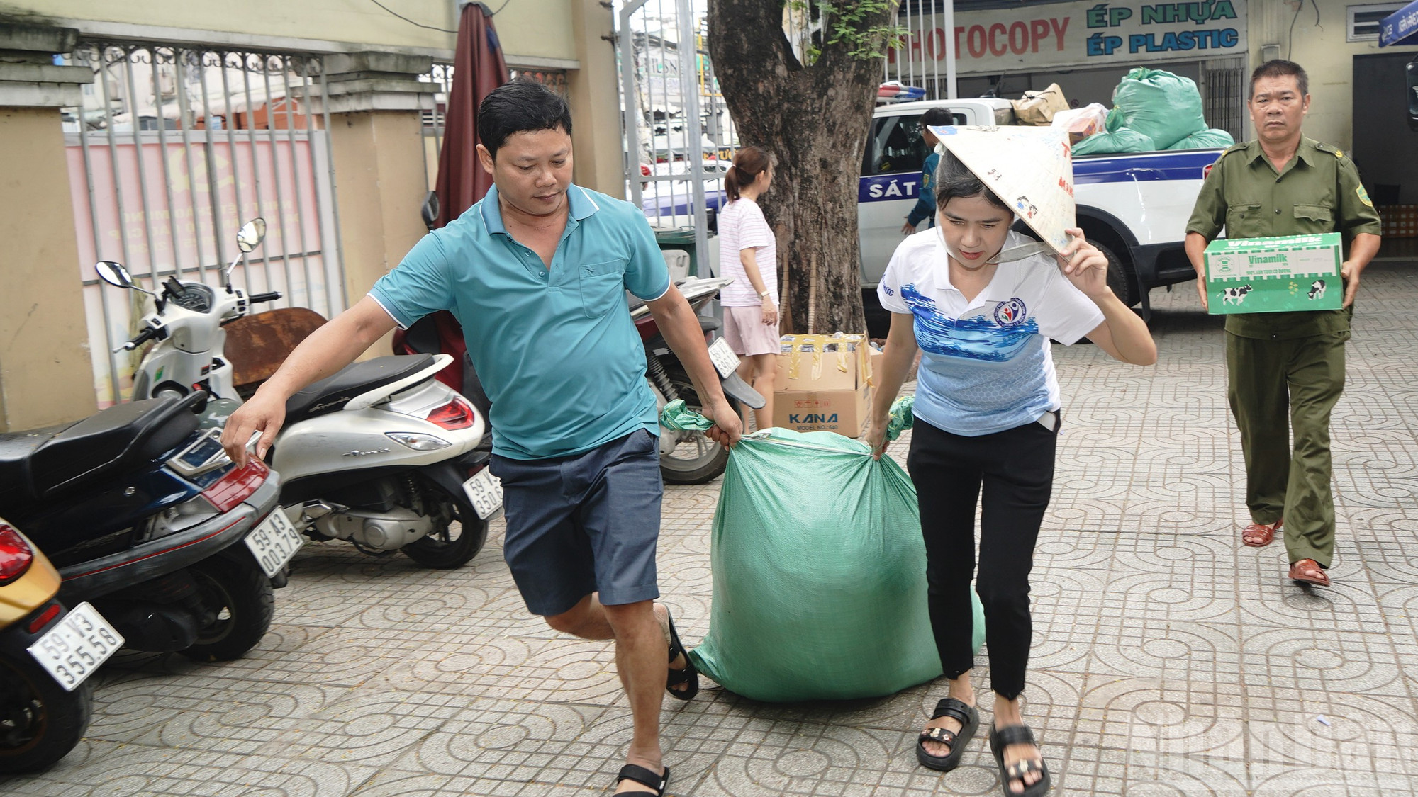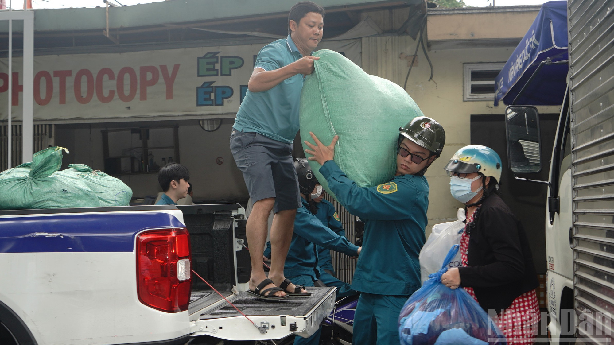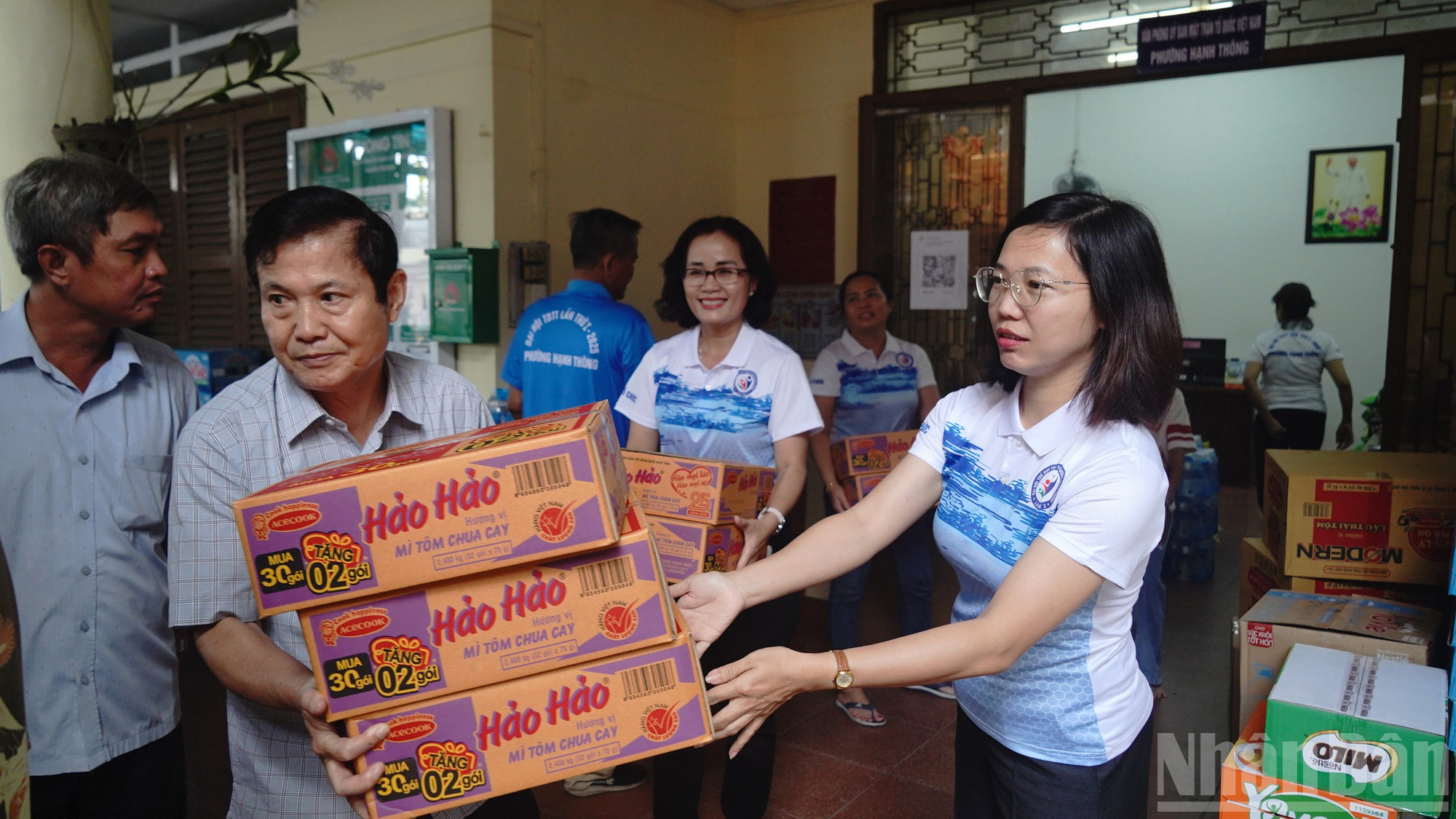Người dân tất bật bưng bê hàng hóa, chở xe chất đầy đồ cứu trợ đến trụ sở phường Hạnh Thông.