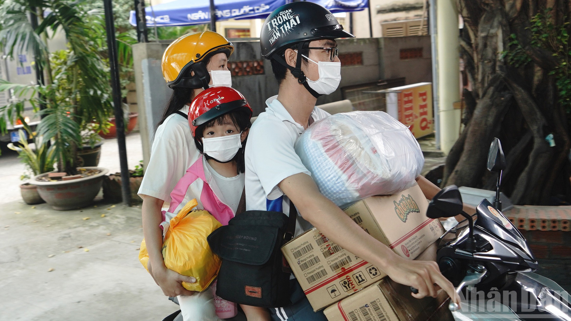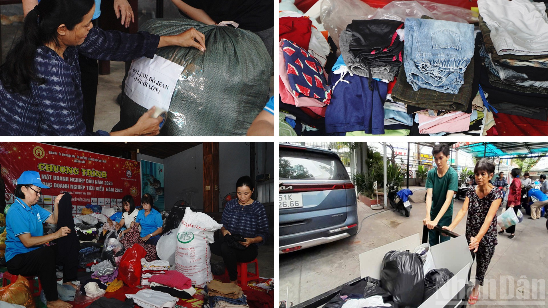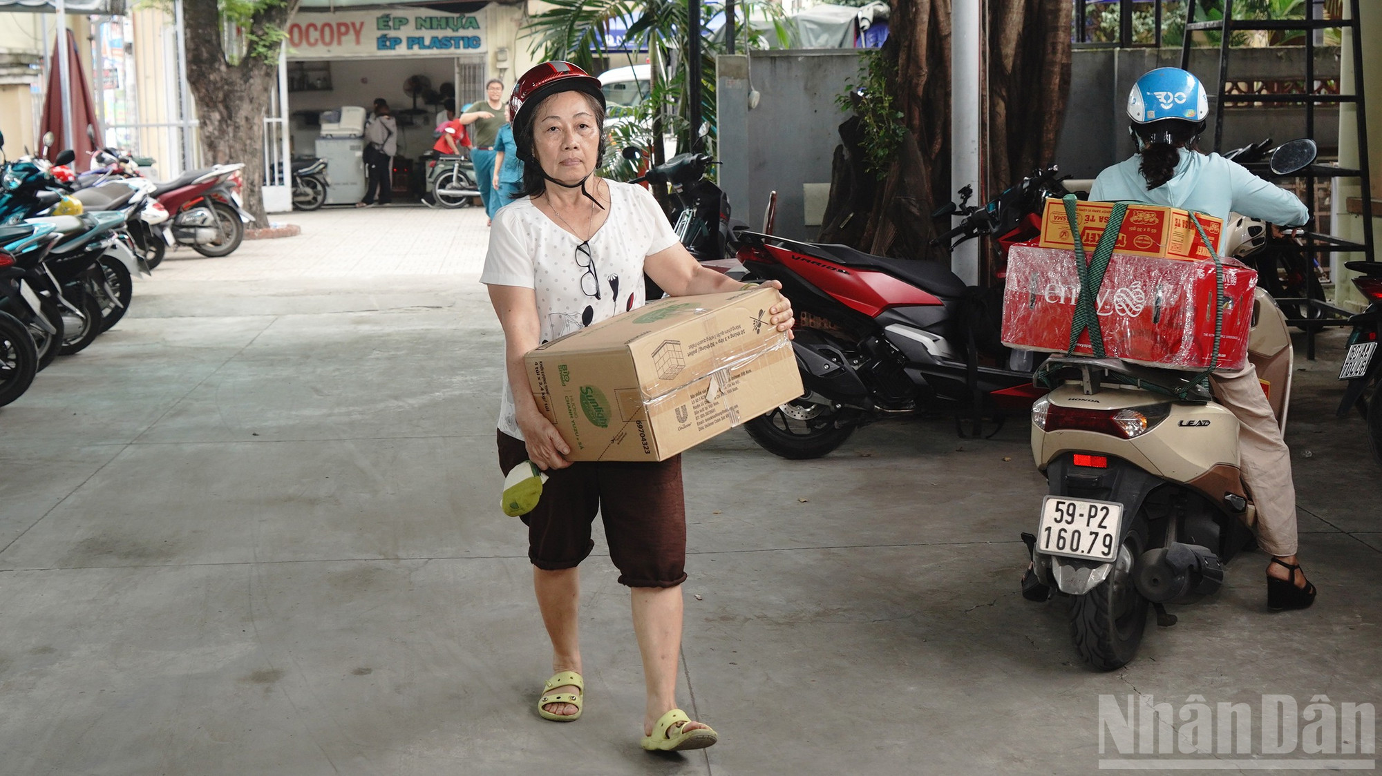 Người dân tất bật bưng bê hàng hóa, chở xe chất đầy đồ cứu trợ đến trụ sở phường Hạnh Thông.