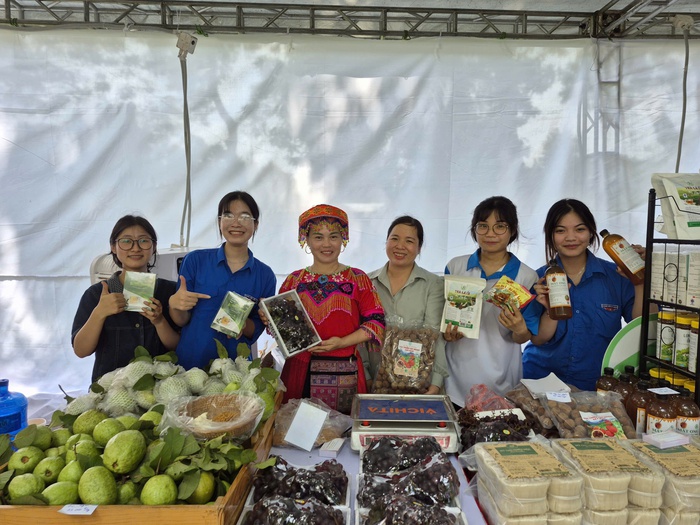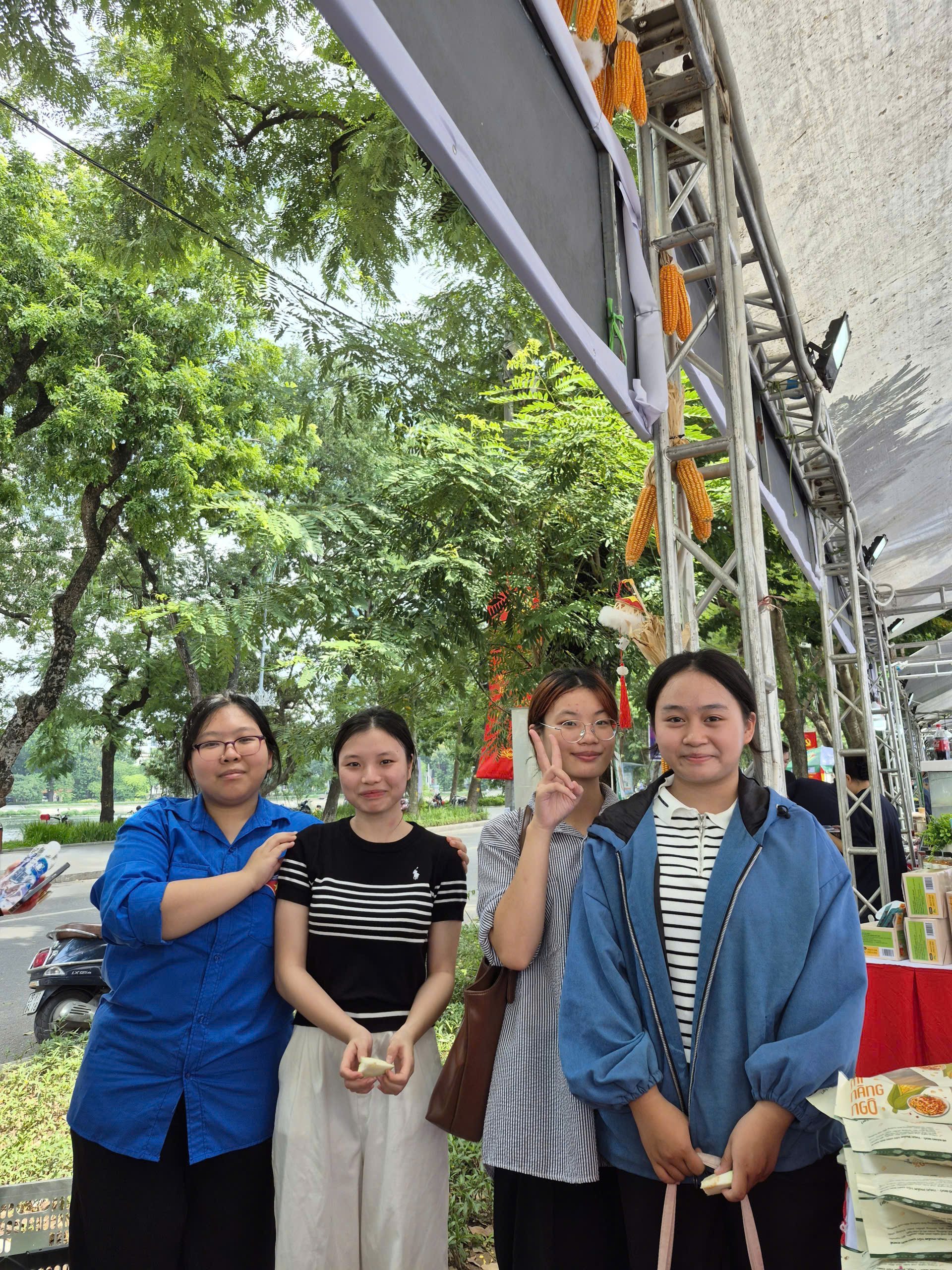 Nhóm sinh viên Học viện Phụ nữ Việt Nam tham gia hỗ trợ tại các gian hàng OCOP tại ngày hội. Ở giữa là chủ của 2 gian hàng, các chị đánh giá cao sự năng động của nhóm tình nguyện viên.
