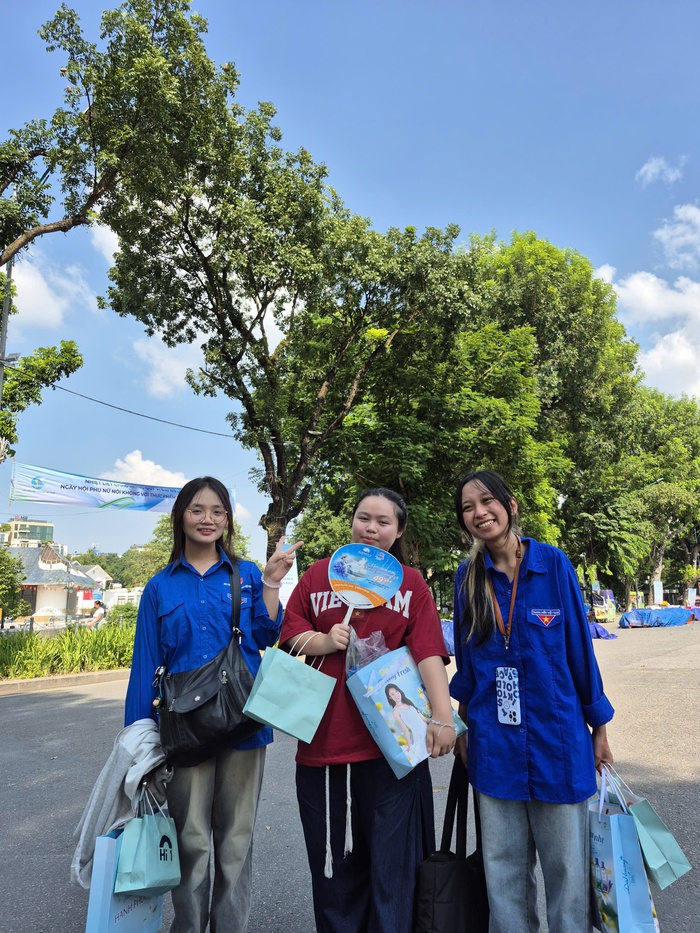 Còn Ngô Ngọc Bích (Quản trị Du lịch K13, Học viện Phụ nữ Việt Nam) lại hóm hỉnh đùa: Ngày hội quá tuyệt khi em và nhóm bạn được trải nghiệm cảm giác "ăn sập các gian hàng". "Nhiều gian hàng tại ngày hội mời ăn thử sản phẩm các vùng miền, các loại quả, đồ ăn vặt, đồ uống... bọn em đi một vòng là… khỏi cần ăn bữa trưa luôn!". "Sau này, Báo Phụ nữ Việt Nam có hoạt động gì, nhắn là bọn em tham gia liền!"... Sự hào hứng của nhóm bạn không chỉ giúp khuấy động không khí mà còn khiến không gian ngày hội luôn đầy ắp tiếng cười.