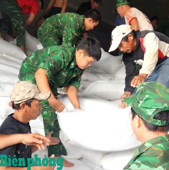 Cán bộ, chiến sĩ Đồn Biên phòng Vạn Hưng, BĐBP tỉnh Khánh Hòa phối hợp với các đơn vị bốc xếp gạo tại Kho dự trữ quốc gia Bắc Ninh Hòa trao tặng cho bà con vùng ngập lụt. Ảnh: CTV