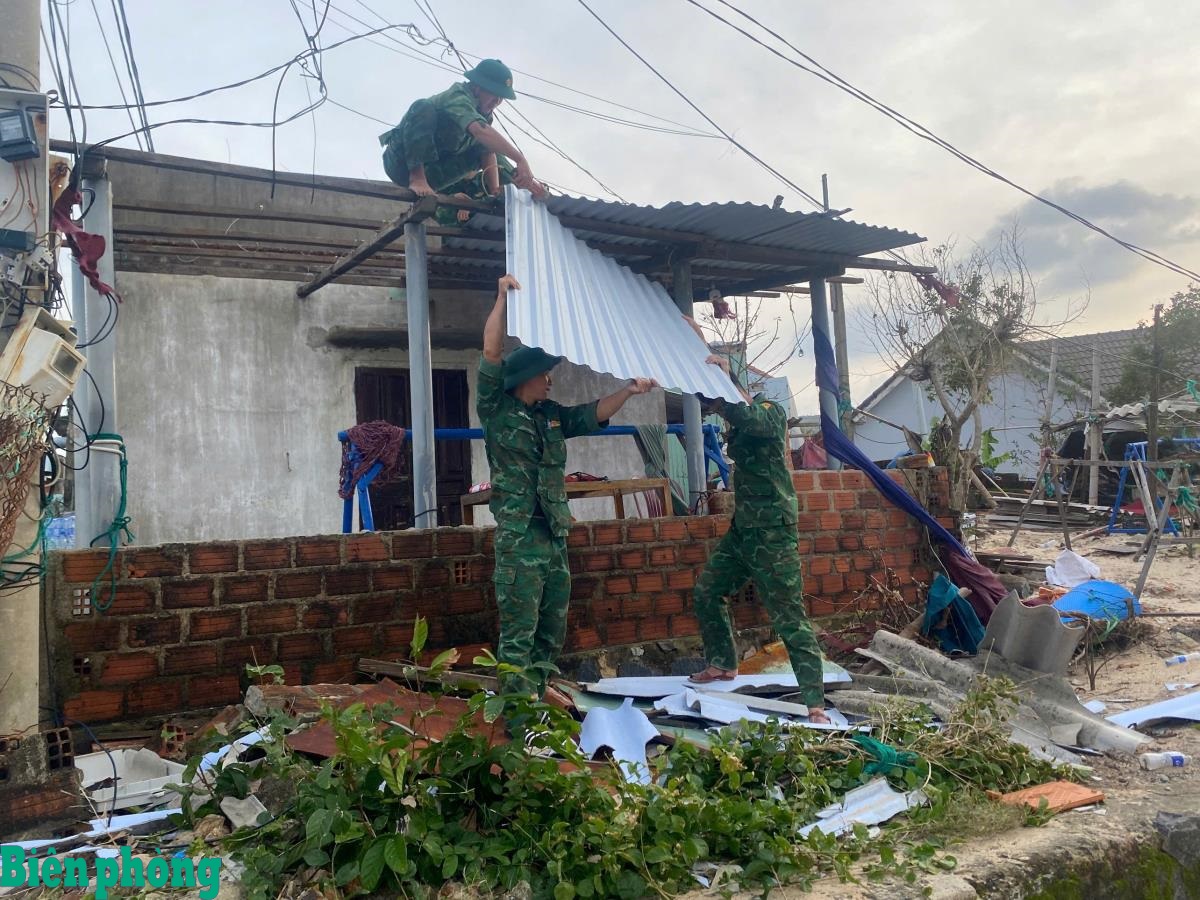 BĐBP Đắk Lắk hỗ trợ người dân sửa chữa nhà cửa bị hư hỏng do mưa lũ.Ảnh: Ngọc Lân