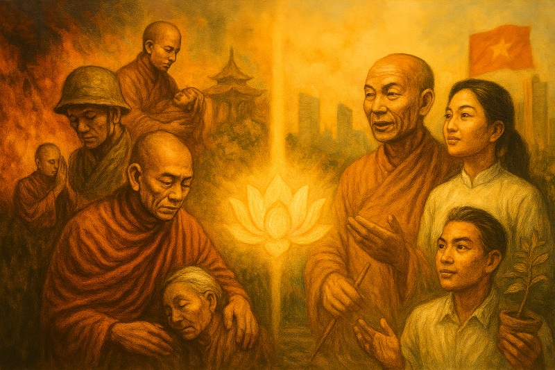 Sau Hiệp định Genève, miền Nam rơi vào chính sách đàn áp tôn giáo. Phong trào đấu tranh Phật giáo 1963 nổ ra, đỉnh cao là ngọn lửa tự thiêu của Bồ tát Thích Quảng Đức ngày 11/6/1963 tại Sài Gòn, tạo chấn động toàn cầu và trở thành biểu tượng của bất bạo động, từ bi, yêu nước. Nhiều tăng ni Phật tử tham gia biểu tình, vận động hòa bình, và bí mật liên lạc với lực lượng cách mạng. Các cơ sở Phật giáo mở trại mồ côi, phòng thuốc nam, cứu trợ nạn nhân chiến tranh, thể hiện rõ tinh thần “từ bi cứu khổ”.