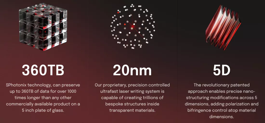 Startup SPhotonix tại Anh, thành lập năm 2024, đang thương mại hóa công nghệ này. Về cơ bản, dữ liệu được khắc vào khối kính siêu bền bằng tia laser siêu chính xác, có khả năng tác động đến vật chất ở mức cực nhỏ. Thay vì chỉ lưu trên bề mặt, thông tin được ghi xuyên suốt toàn bộ khối kính, giúp tăng mật độ lưu trữ và độ bền. Dữ liệu được mã hóa theo năm yếu tố: Ba chiều không gian cùng hai đặc tính quang học về hướng và cường độ. Nhờ vậy, một chiếc đĩa kính có kích thước tương tự đĩa CD/DVD truyền thống có thể chứa tới 360 TB dữ liệu.