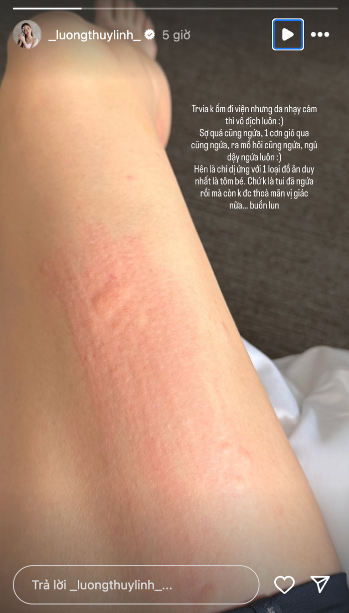 Lương Thùy Linh buồn bã chia sẻ hình ảnh làn da bị nổi mẩn đỏ. Ảnh: IGNV